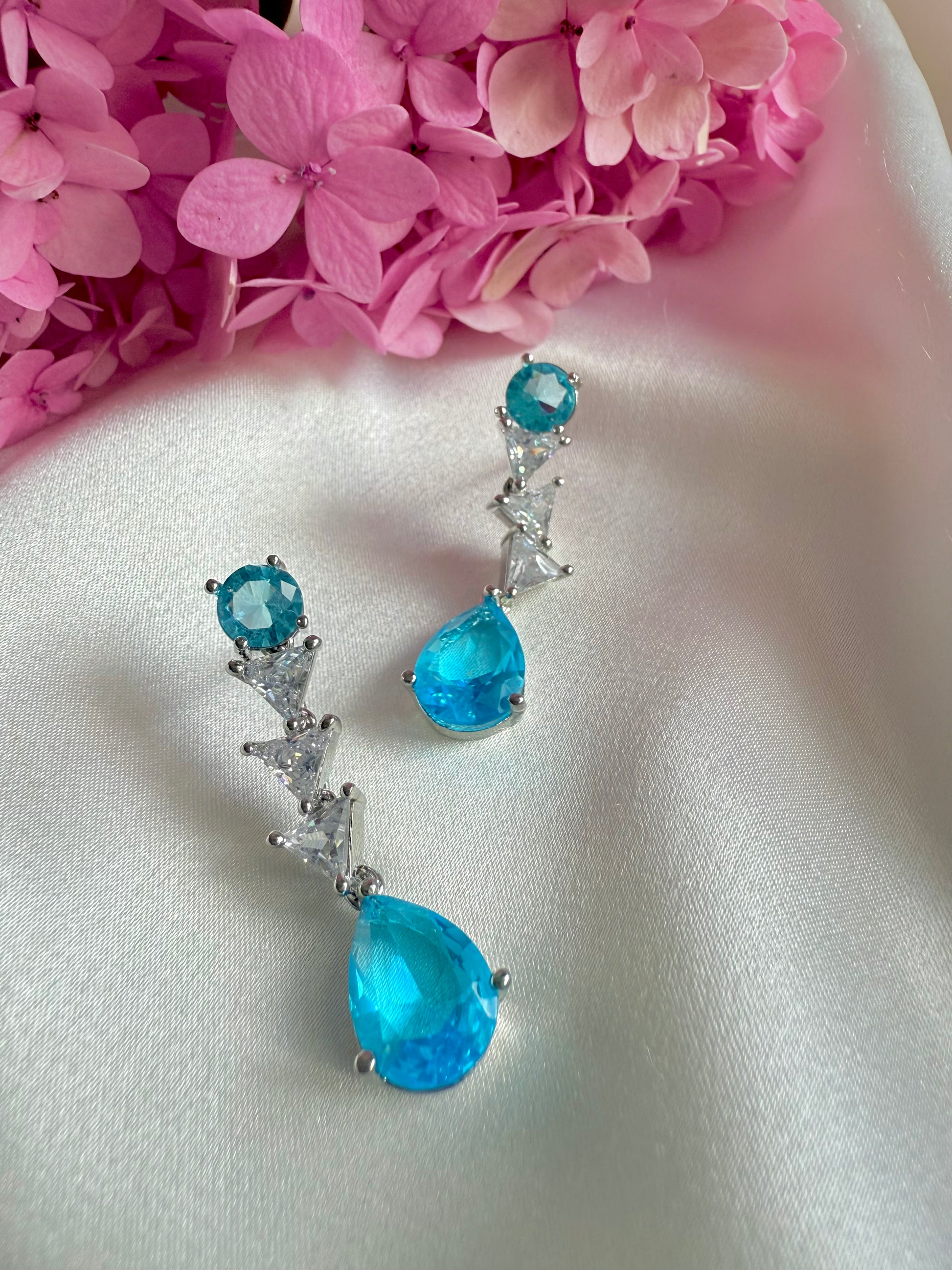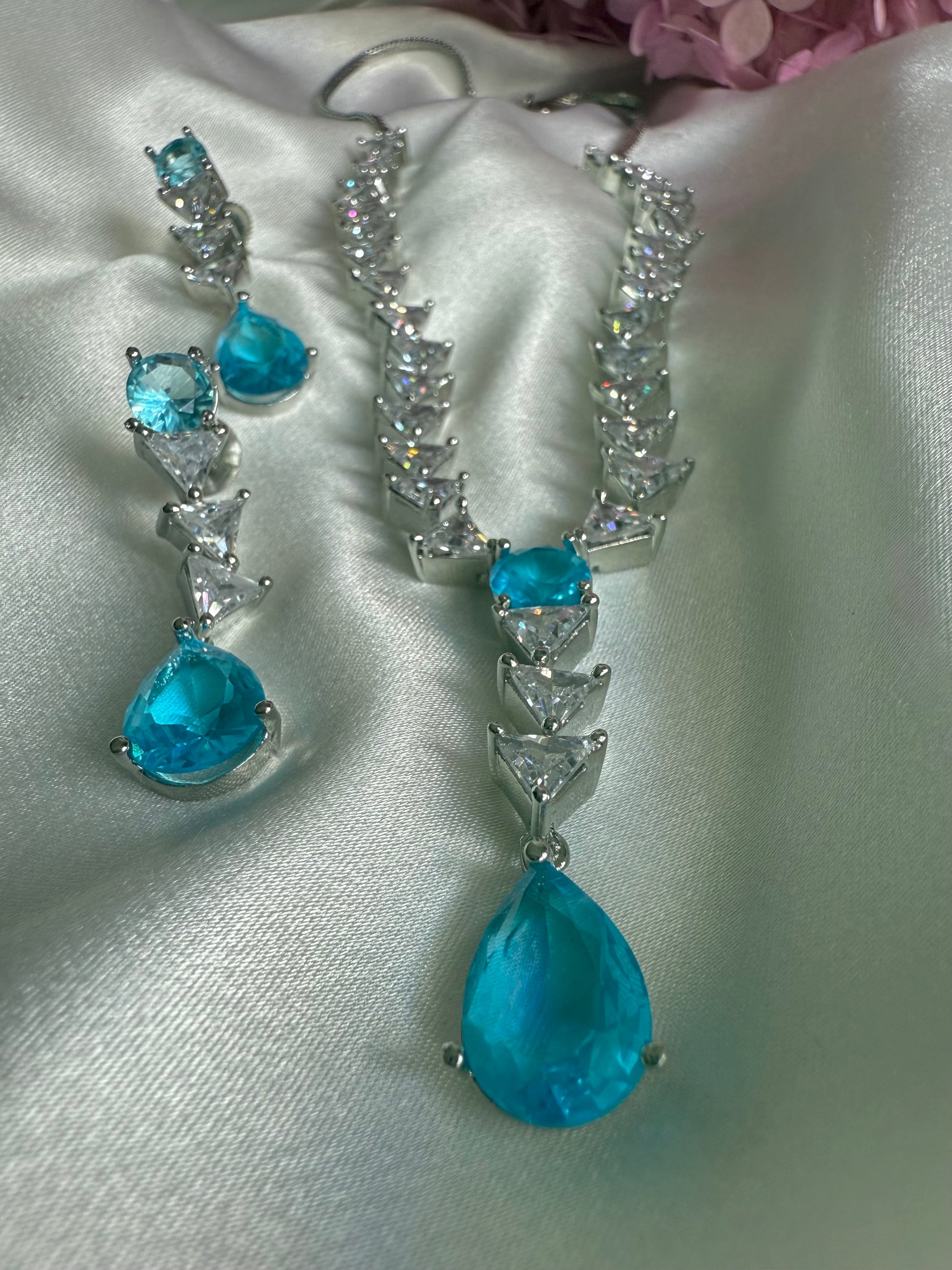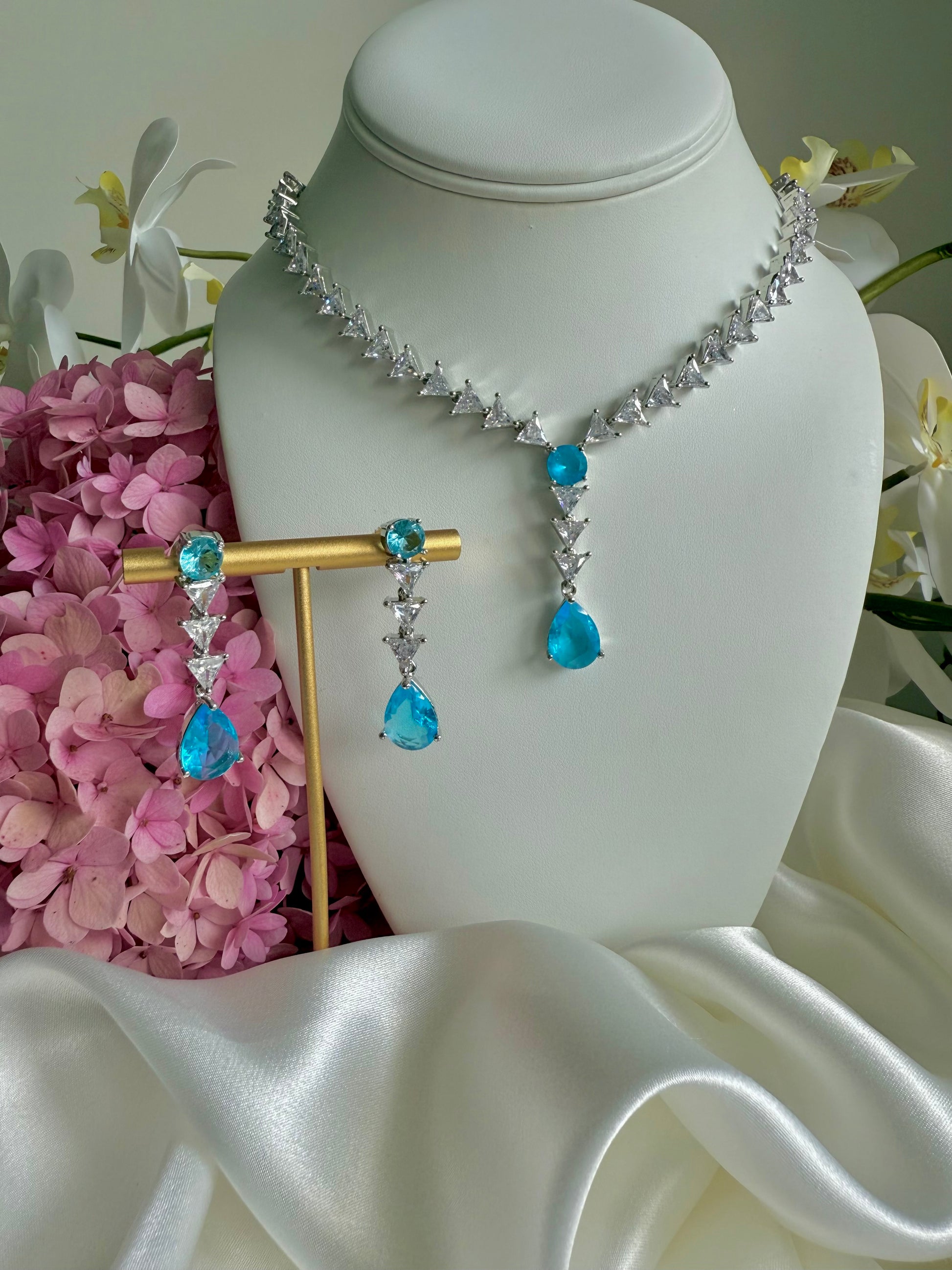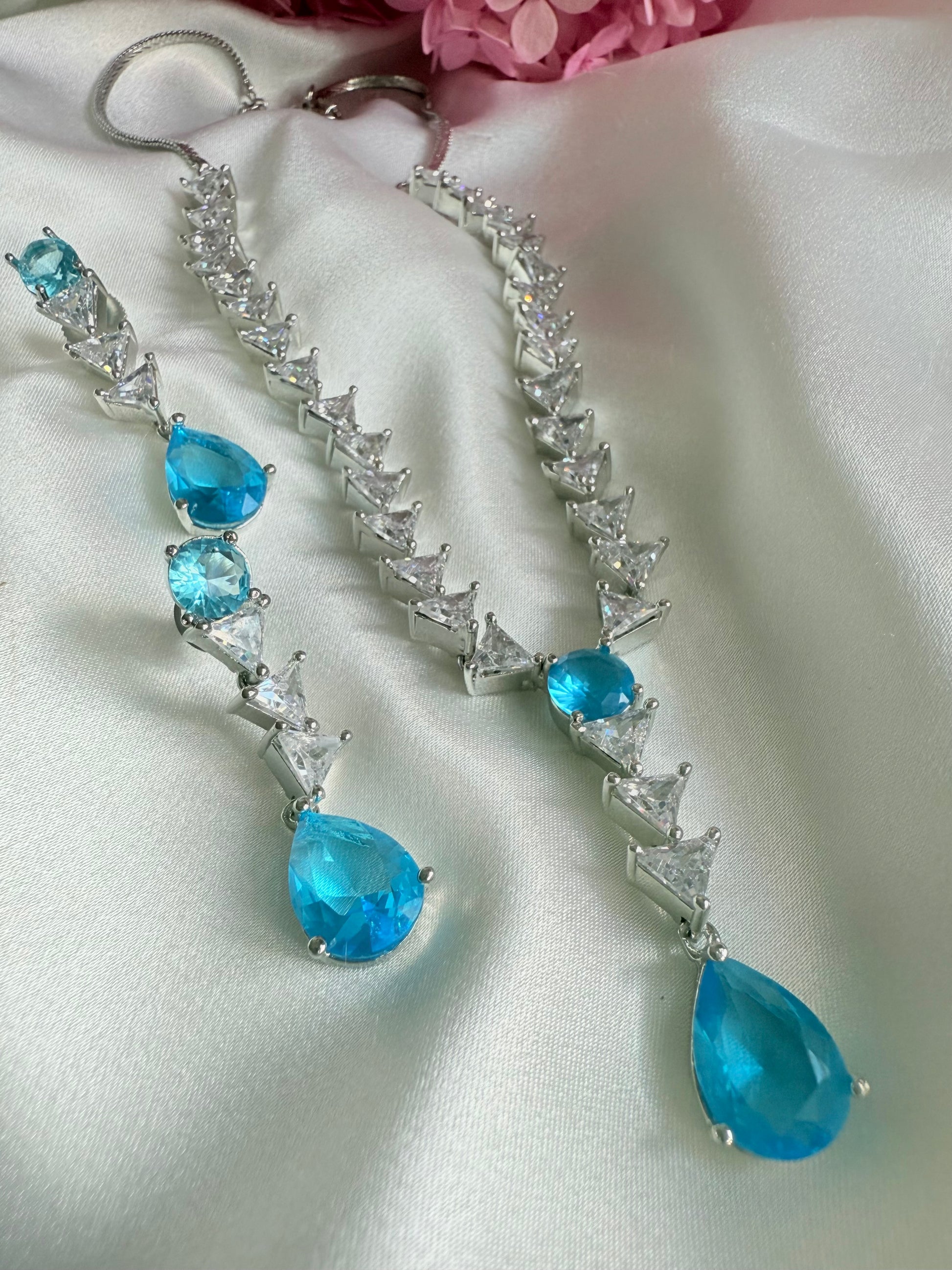Radiate elegance and tranquility with this exquisite aqua blue necklace set, beautifully designed to capture the serene hues of the ocean. Delicately accented with sparkling cubic zirconia and semi-precious blue stones.